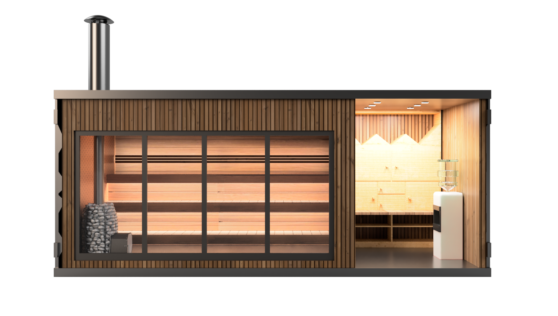 Step into relaxation with the "Ranta" container sauna, a perfect blend of contemporary design and traditional warmth. Crafted within a repurposed shipping container, Ranta offers a sleek, Scandinavian-inspired aesthetic that brings luxury and wellness into any setting—be it a lakeside retreat, a cozy garden corner, or a modern spa facility.